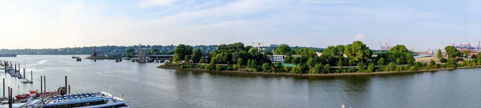 Der Gorch-Fock-Park an der Spitze der Köhlfleet-Mündung bietet den freien Blick in beide Richtungen der Elbe.